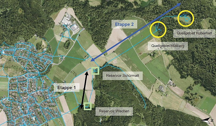 «Die Quellfassungen und Brunnenstuben ‹Kubismatt oben› (Baujahr 1898) und ‹Kubismatt unten› (Baujahr 1983) sowie die Quellfassungen Müliberg (Baujahr 1898) entsprechen nicht mehr den aktuellen Richtlinien und Vorgaben und müssen erneuert werden. Im Gegensatz dazu wurde die Sammelbrunnenstube Müliberg im Jahr 1998 vollständig erneuert und erfüllt die geltenden Anforderungen», heisst es dazu im Beleuchtenden Bericht. Daher bleibe die Sammelbrunnenstube Müliberg bestehen. Im Weiteren werden die Quellableitungen zwischen den Brunnenstuben Kubismatt oben und unten sowie der Sammelbrunnenstube Müliberg erneuert. Die alte, zu klein dimensionierte Transportleitung zum ehemaligen Reservoir Schürmatt wird im Zuge der Baumassnahmen ebenfalls ersetzt und auf den in einer ersten Etappe verbauten Durchmesser ausgebaut. «Arbeiten an Quellfassungen können nicht detailliert geplant werden, da erst, wenn der Boden geöffnet ist, ersichtlich wird, wo das Wasser fliesst und welche Adern am besten gefasst werden. Die Kostenschätzung berücksichtigt diesen Umstand durch die Einstellung von Reserven», heisst es im Bericht weiter.