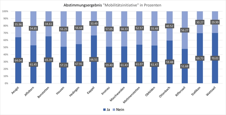 Die «Mobilitätsinitiative» wurde im Kanton Zürich mit 56,8 Prozent angenommen. Die Zustimmung im Bezirk Affoltern lag bei 63,3 Prozent. Blickt man auf die einzelnen Gemeinden, so war die Zustimmung in den Gemeinden Wettswil (70 %) und Stallikon (69,7 %) am höchsten. Die geringste Zustimmung kam aus Hausen mit 57,2 Prozent. Die Stimmbeteiligung im Bezirk lag im Schnitt knapp über 50 Prozent. Die Unterschiede waren aber je nach kommunaler Vorlage beträchtlich. So waren in Rifferswil 71,5 Prozent der Stimmberechtigten an der Urne. Auch Wettswil lag bei 60 Prozent Stimmbeteiligung. Schlusslichter waren mit um die 42 Prozent die Stadt Affoltern und Obfelden. Diese Stimmbeteiligungswerte basieren auf den nationalen Abstimmungen und können je nach Vorlage leicht unterschiedlich ausfallen.