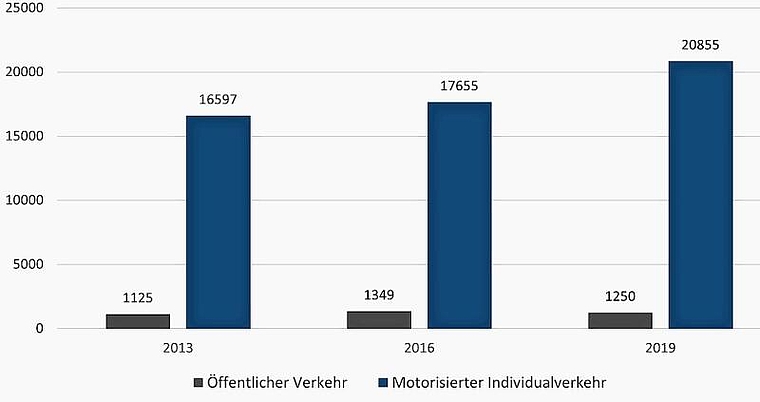 Knapp ein Fünftel beträgt der Anteil an Personenwegen am Gesamtverkehr vom und nach dem Knonauer Amt. Wie das Zürcher Amt für Mobilität dazu erklärt, beinhalten Personenwege sämtliche Bewegungen mit dem öffentlichen, aber auch dem individuellen Verkehr. Zudem ist auch der Freizeit- und Einkaufsverkehr darin enthalten und nicht nur der Berufsverkehr. Die Zahlen des Gesamtverkehrsmodells des Kantons Zürich zeigen einen Anstieg des durchschnittlichen Werktagsverkehrs vom Knonauer Amt in Richtung Zug/Innerschweiz. So waren 2013 noch 16597 Personen pro Tag im motorisierten Individualverkehr (MIV) unterwegs. Die aktuellsten verfügbaren Zahlen stammen aus dem Jahr 2019. So waren 20855 Personen täglich unterwegs. Dem MIV entgegengesetzt sind die ÖV-Zahlen. So waren 2019 nur 1250 pro Tag mit dem öffentlichen Verkehr in die Innerschweiz unterwegs. Dieser Wert blieb seit 2013 stabil. Die Leute fahren also vermehrt mit dem Auto in die Innerschweiz. In Relation dazu bewegten sich 2019 täglich 4811 Personen allein in die Stadt Zürich. Das Amt für Mobilität merkt dazu allerdings an, dass die Messmethoden für die aktuellsten Zahlen geändert wurden.